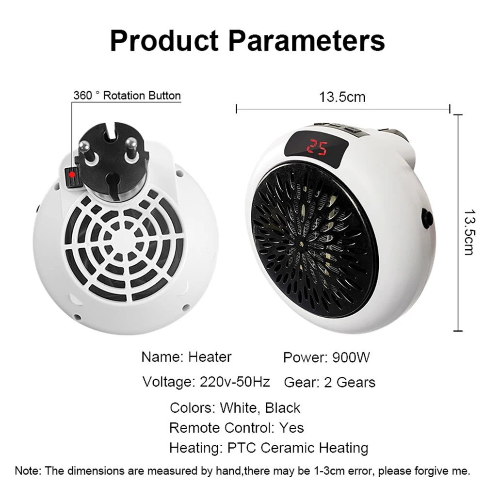 Характеристика: -Безопасный и надежный: PTC керамика генерирует много тепла после включения. Вентилятор выдувает горячий воздух для создания конвекции и безопасного нагрева. -Более быстрое рассеивание тепла: с тонкой металлической решеткой, высокой термостойкостью, более быстрым и безопасным рассеиванием тепла. -Светодиодный дисплей температуры: температурный дисплей позволяет более точно измерить температуру в помещении. -Маленький и портативный: маленький и легкий, легко носить с собой, подходит для домашнего или офисного использования. -Нагревательный партнер: Этот мини-Электрический воздушный обогреватель предназначен для того, чтобы обеспечить вам теплую и комфортную компанию на всю зиму. Характеристики: Материал: корпус ABS + железный лист + нагревательный лист Дисплей: светодиодный цифровой дисплей Мощность: 900 Вт Уровень напряжения: 220-240 В Номинальная частота: 50 / 60 Гц Установленная температура: 15-32 °C Скорость холостого хода вентилятора: 3000 (низкий) / 4400 (высокий) об/мин Объем воздуха: 30 (низкий) / 40 (высокий) CFM Программируемый Таймер: 1/2/3/4/5/6/7/8/9/10/11/12 часов Сертификат: CE / RoHS Размеры: 13,5x10,6x13,5 см Упаковочный лист: 1 * тепловентилятор 1 * удлинитель 1 * bracketa 1 * пульт дистанционного управления 1 * Руководство пользователя