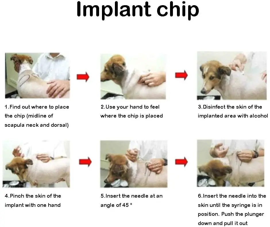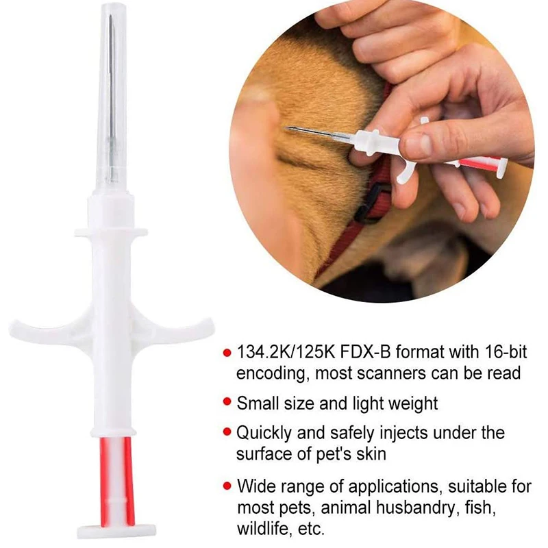 Packing material: breathable paper for medical use Frequency: 134.2K/125K Chip size: 2.12*12/1.4*8/1.25*7mm Disinfection method: EO (Ethylene Oxide) disinfection, valid for five years Syringe color: white + blue/red syringe barrel, detachable needle Package visible information:Disinfection date, effective use date, 15-digit code (in the form of bar code) Weight: 8.5 grams (0.02 grams per chip) Chip type: EM4305 Chip material: internal lead-free and non-toxic material; external bioglass Executive standard: ISO11784/11785 FDX-B