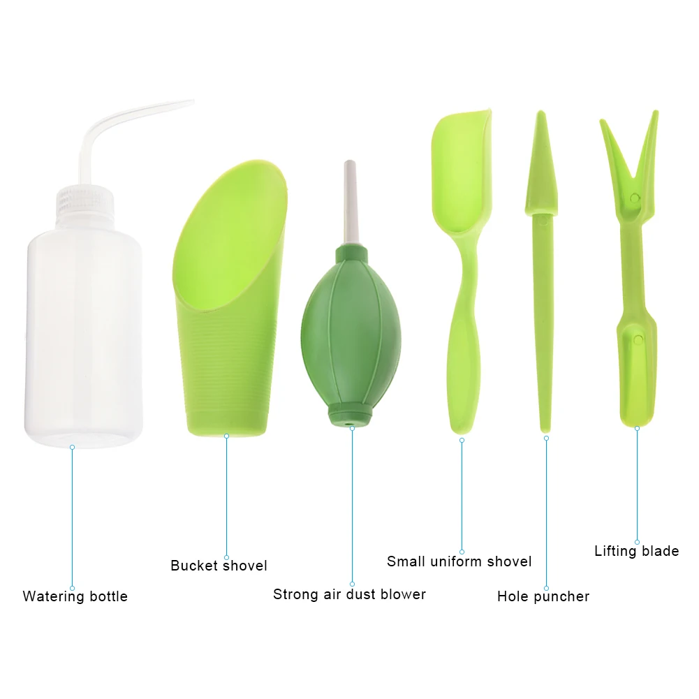 В комплект входит ковшовая лопата, 250 мл Лейка для полива, сильный воздушный пылеуловитель, подъемное лезвие, дырокол, маленькая однородная Лопата