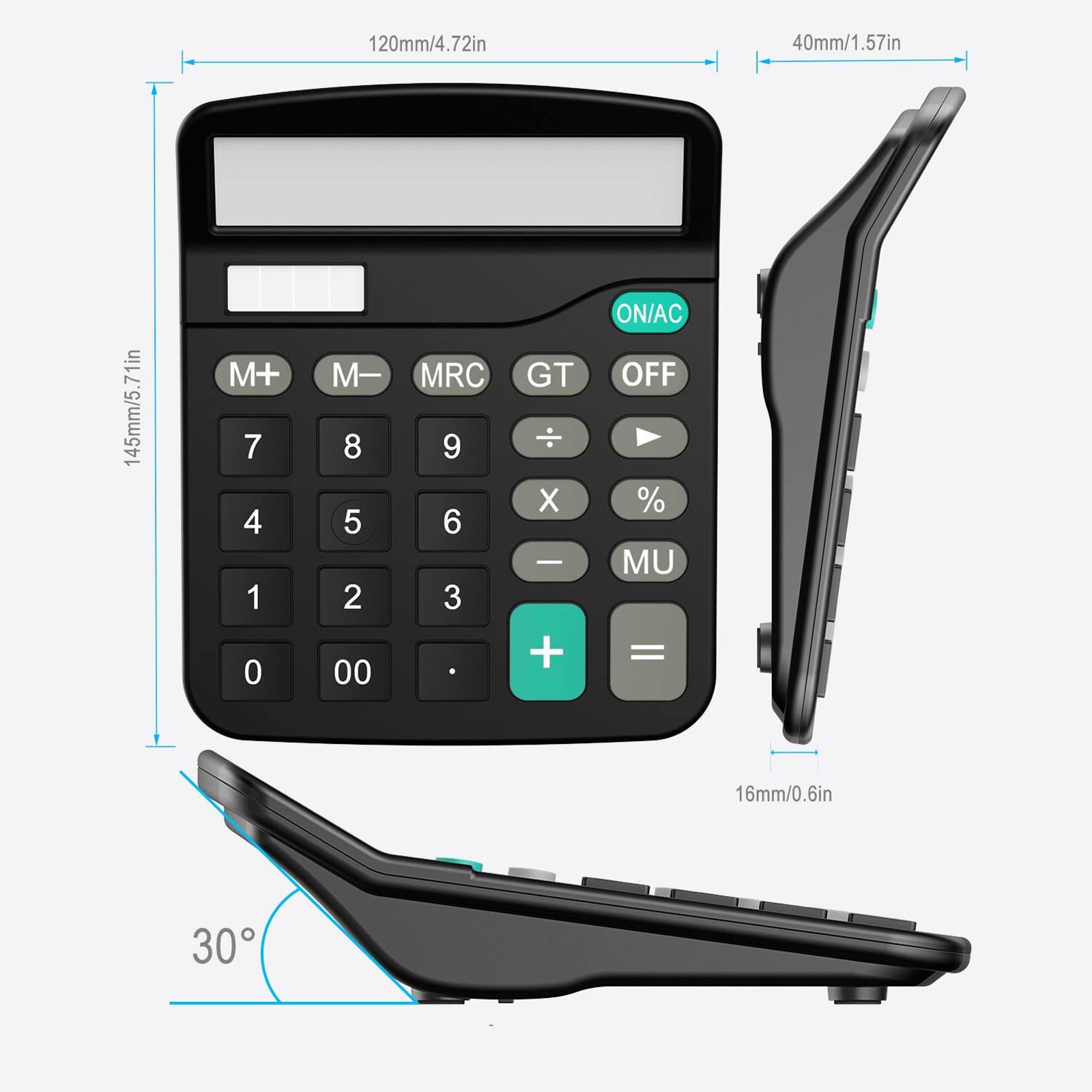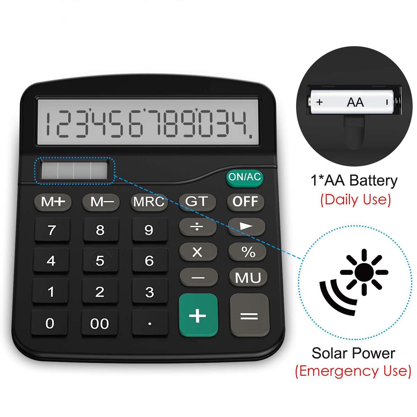 Длительный срок службы: батарея AA (не входит в комплект) и солнечные панели помогают гарантировать, что калькулятор может работать даже в тускло освещенных местах.