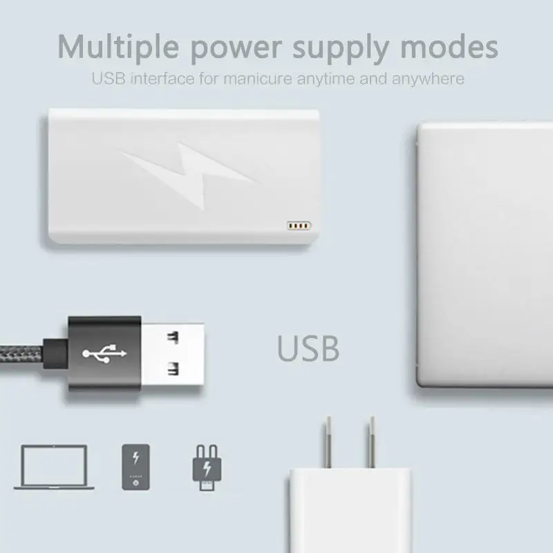 Питание осуществляется через usb-интерфейс, его можно подключить к любым usb-устройствам питания, таким как зарядные головки Apple, Зарядные головки Android, банки питания, компьютеры, автомобильные зарядные устройства и т. Д. Удобно носить с собой и работать, и вы можете делать Нейл-арт в любое время и в любом месте.