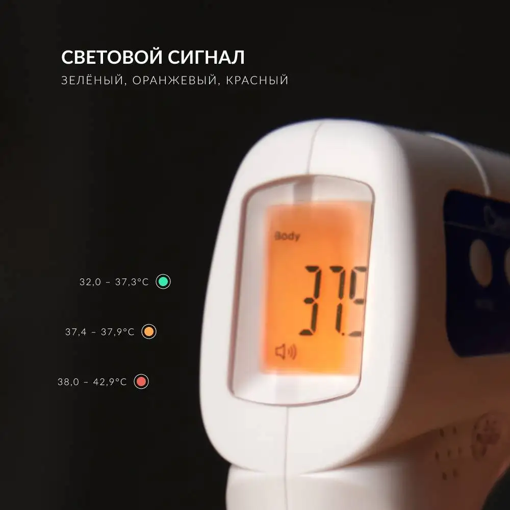 Бесконтактный инфракрасный термометр Berrcom JXB-178 обеспечит точное и полностью безопасное измерение температуры тела, а также поверхности предметов и воздуха в помещении. Пользоваться устройством просто: выберите область применения – «Body» или «Surface», далее поднесите прибор на расстояние 3-5 см ото лба или предмета, нажмите кнопку «Scan» – термометр покажет температуру мгновенно. В режиме «Room» просто нажмите кнопку сканирования, держа устройство в руке. Термометр JXB-178 способен сохранять в памяти данные до 32 измерений в градусах Цельсия или Фаренгейта. Оранжевый или красный световой индикатор в сочетании со звуковым сигналом мгновенно оповестит о повышенной температуре тела.