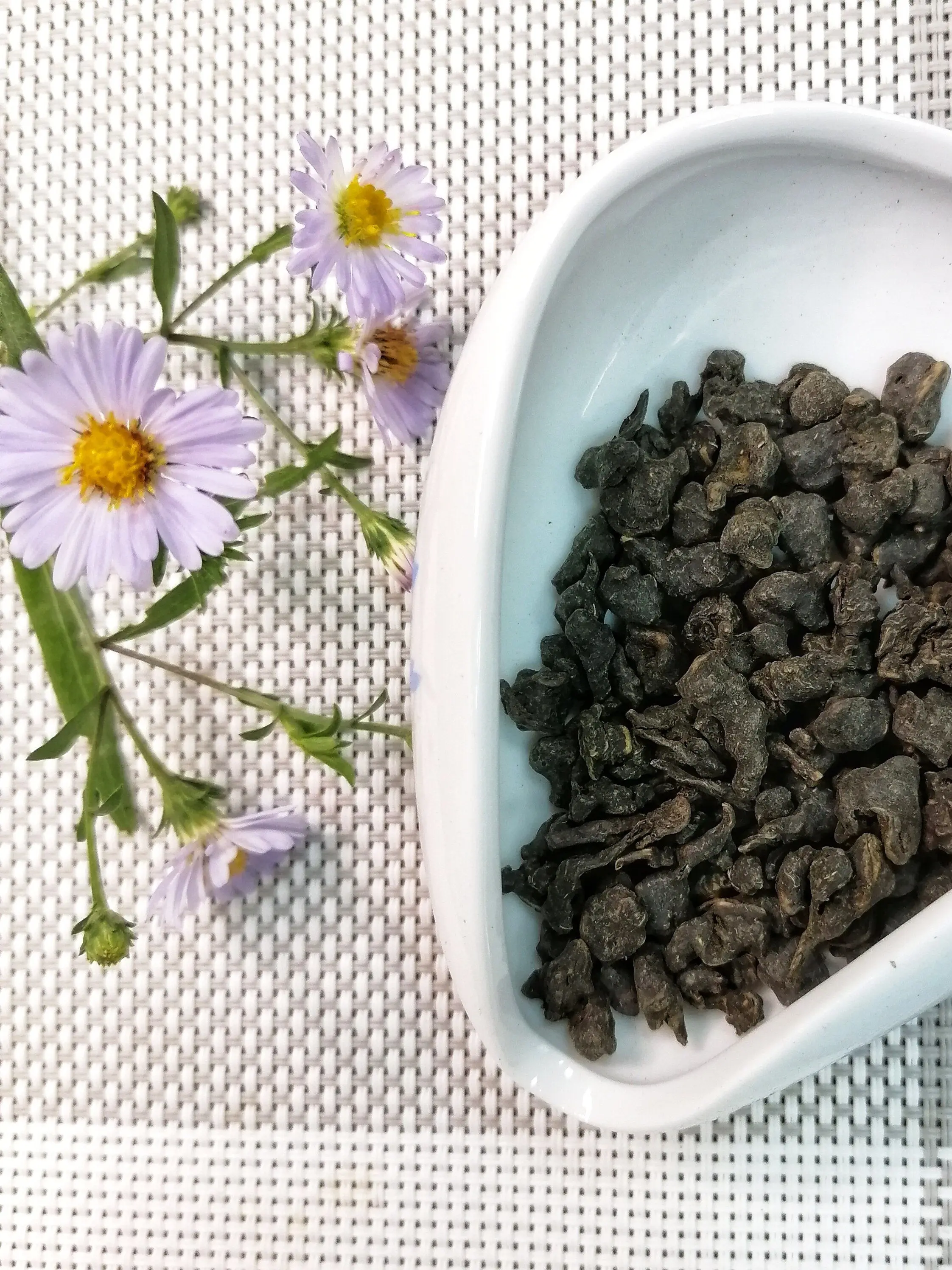 Такой чай - это тугоскрученные листья светлого улуна, обваленные в порошке