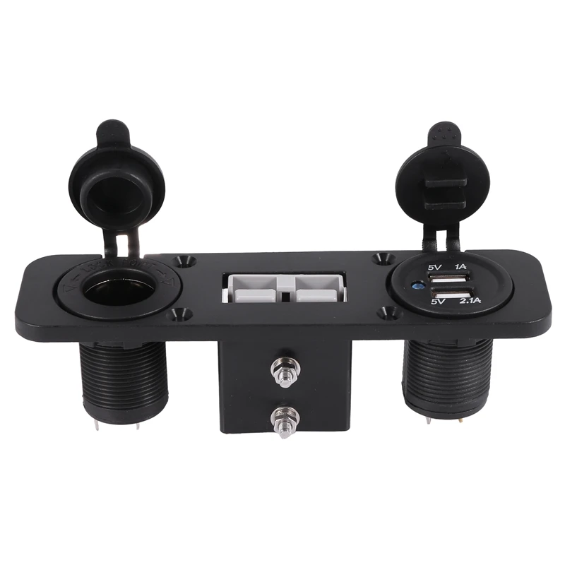 A flush mounting bracket with a recessed 50A Anderson connector and 2 x USB sockets and Cigarette lighter socket for mounting into trims and panels.