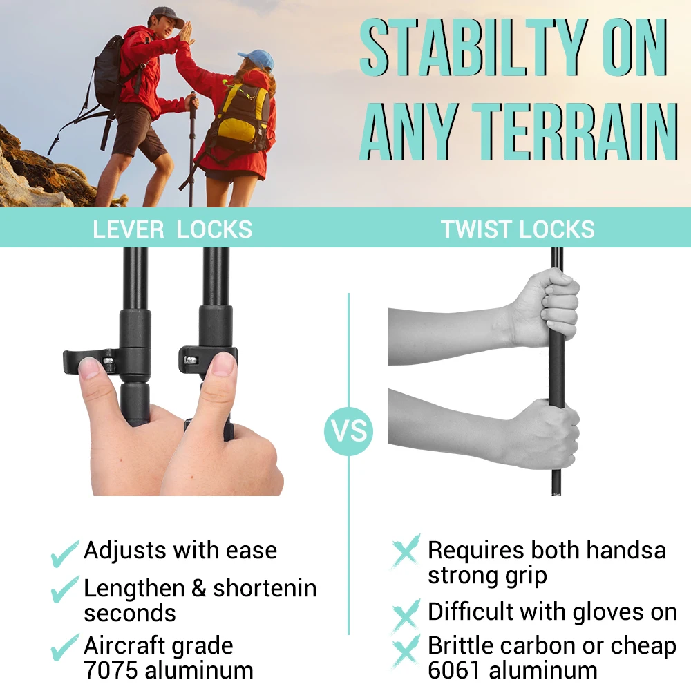 【Высококачественный авиационный алюминий серии 7 предлагает ультра-светильник, но прочную поддержку в вашем путешествии, являются незаменимыми инструментами для прогулок, походов, путешествий, кемпинга, альпинизма, альпинизма. Резиновые + EVA поролоновые ручки обеспечивают мягкость и комфорт, что позволяет вам идти дальше.