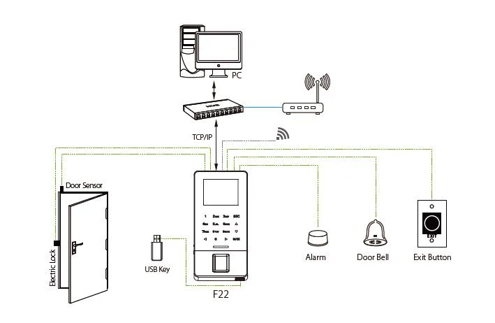 F22 обеспечивает превосходное прикосновение к сенсорной клавиатуре и обеспечивает гибкость для самостоятельной установки или с любой третьей вечерние панелью управления доступом, которая поддерживает стандартный сигнал wiegand. TCP/IP, RS485 и Wi-Fi также доступны, что устройство может использоваться в различных сетях