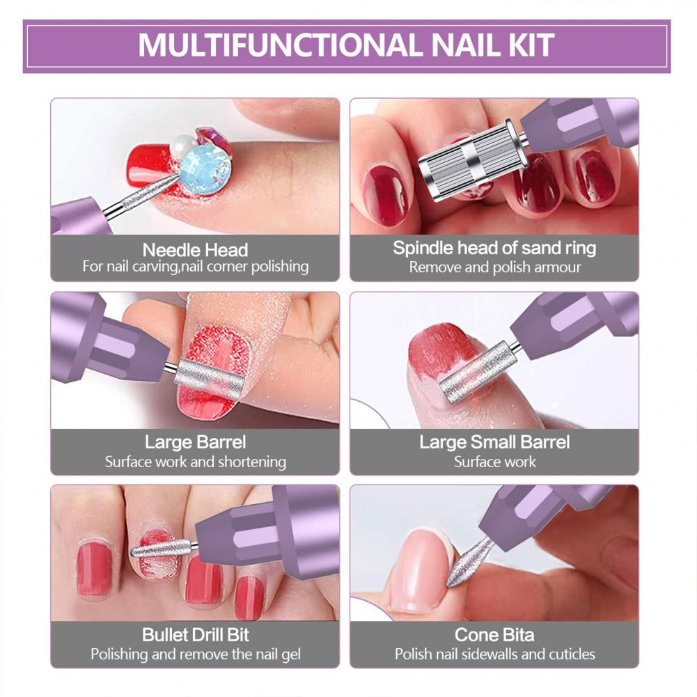 Поставляется с этой сверлильной машиной, которая эффективно формирует или изгибает ваши стили ногтей для создания очаровательной и гладкой, ее высокая скорость вращения позволит глубоко очистить омертвевшую кожу, кутикулу, гель для ногтей и сломанные ногти для нежной деликатной сверлильной головки.