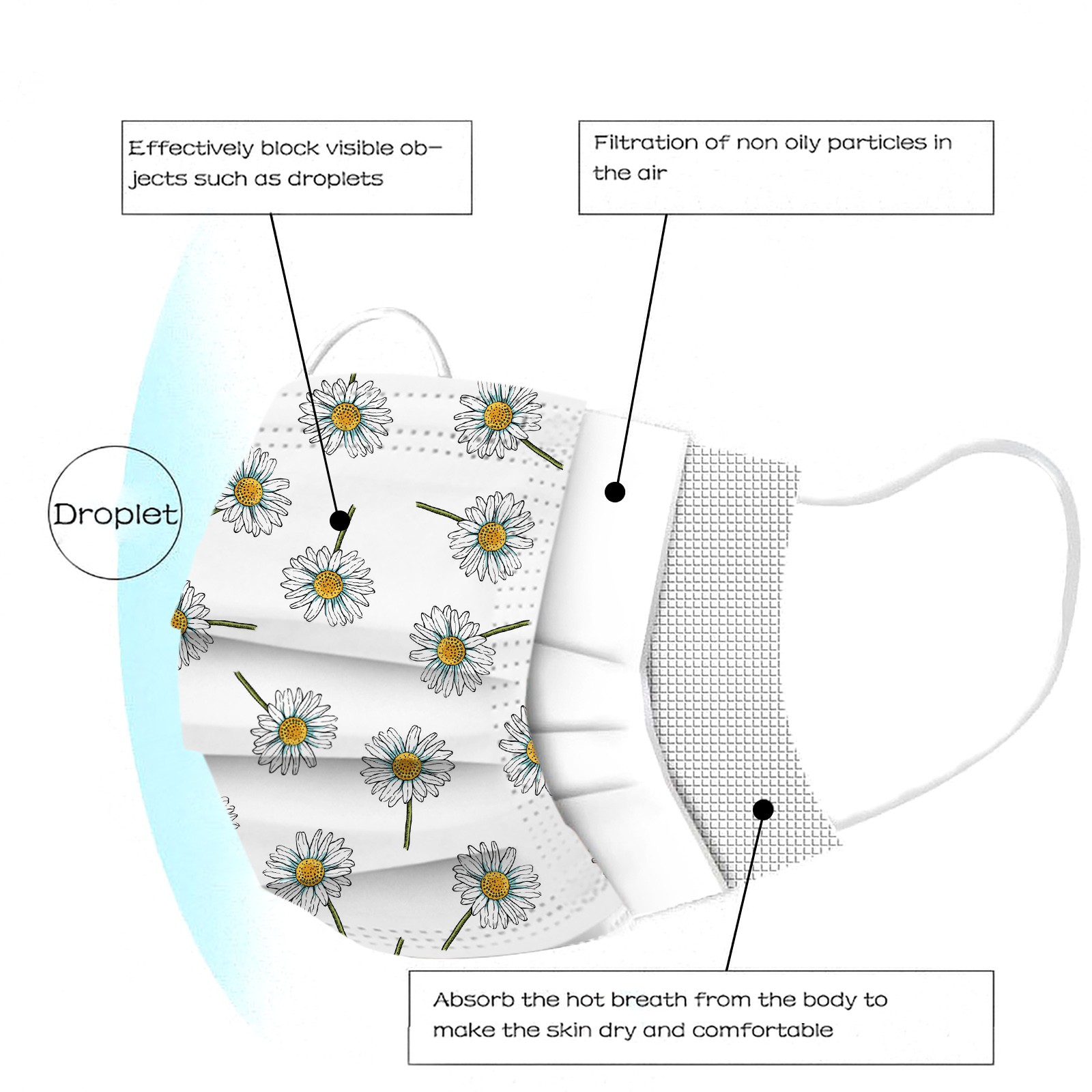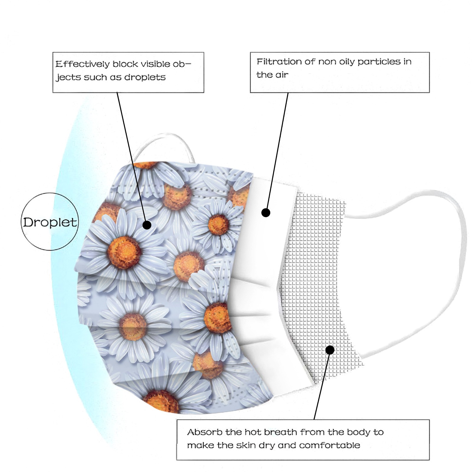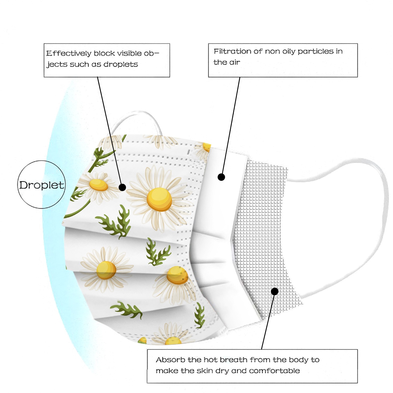 3 слоя гидросплетенная ткань одноразовая маска изготовлена из 3 слоев материала спанлейс, это и безопасный для вас, чтобы использовать. Дышащий материал и милые узоры, что делает его полезным и модным. Специальный 3 слоя гидросплетенная ткань дизайн, обеспечивает некоторые защита от автомобильный отходящий газ, пыльцу и т. Д. Эластичная петля уха позволяет легко снимать и надевать цепочку и не давит на уши. Маникюрный салон или любые другие области, где может потребоваться защита