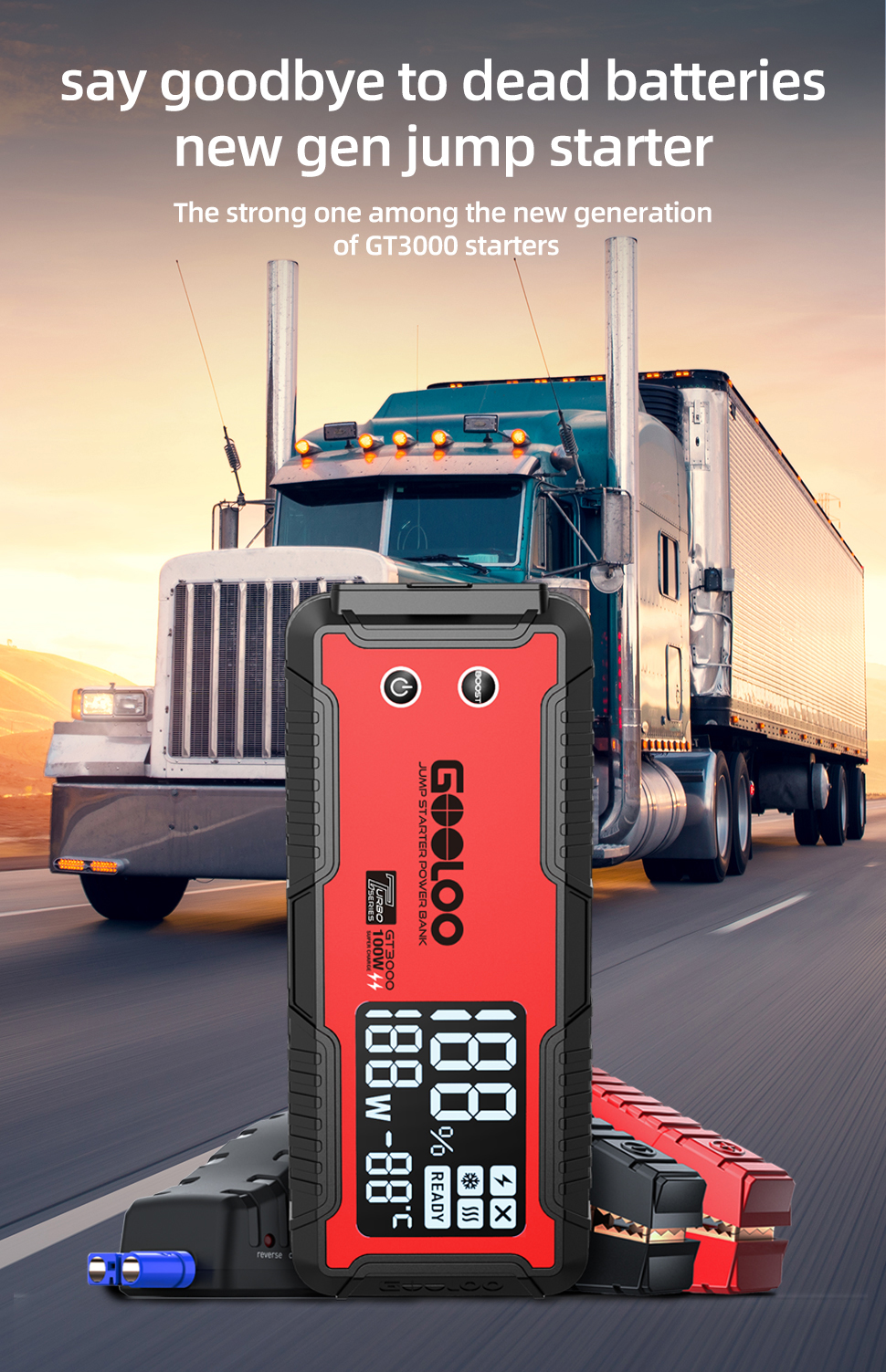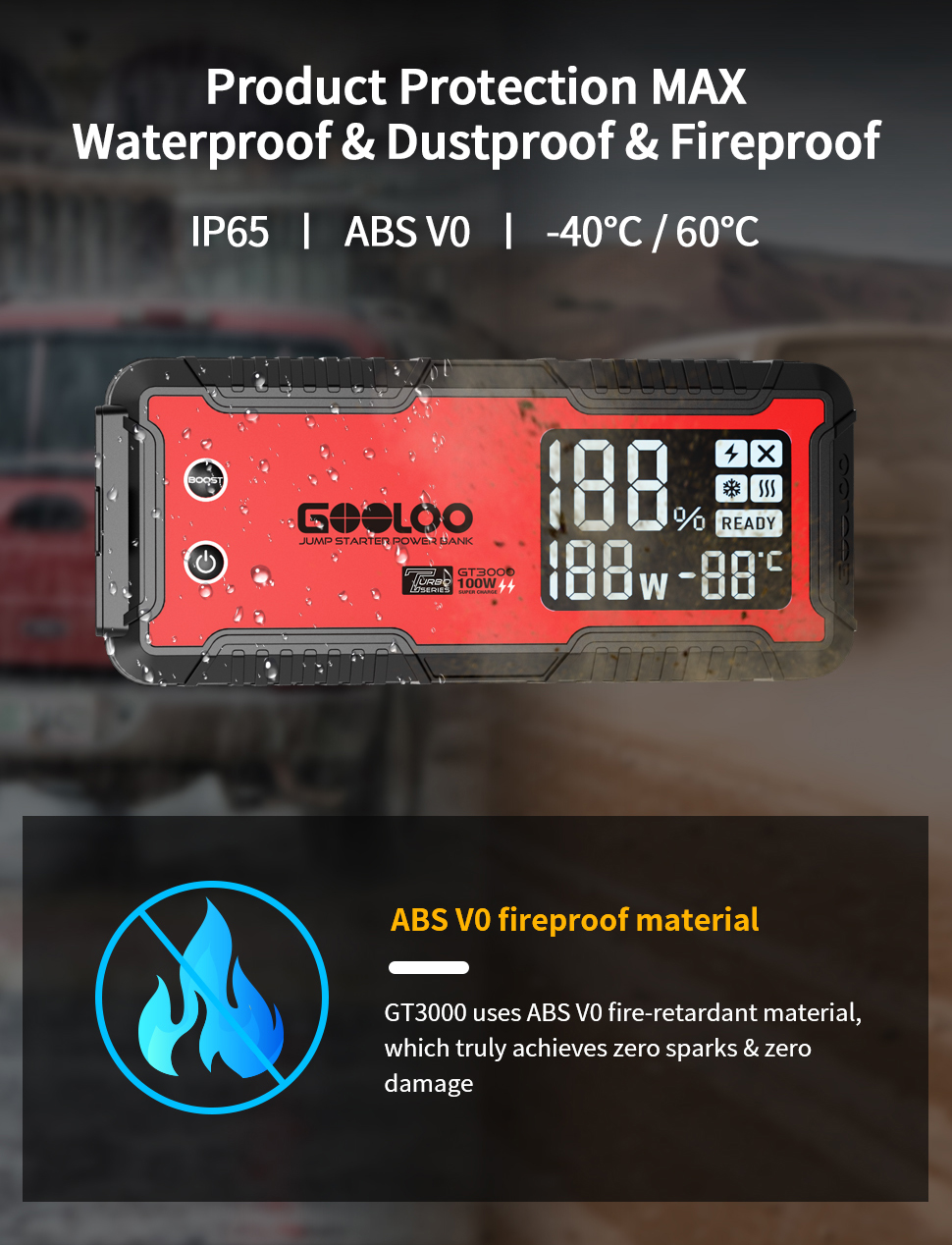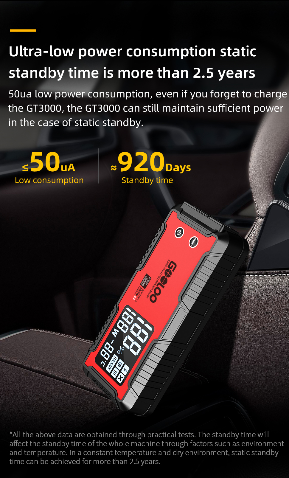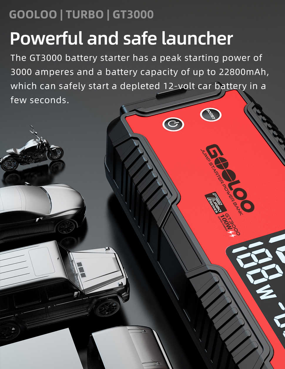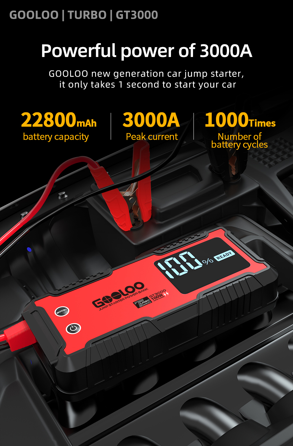 В GT3000 аккумулятор стартовый набор имеет пик пусковая мощность 3000 ампер и аккумулятором емкостью до 22800 мА/ч, которые можно смело начинать запасы 12 вольт автомобильный аккумулятор за считанные секунды.