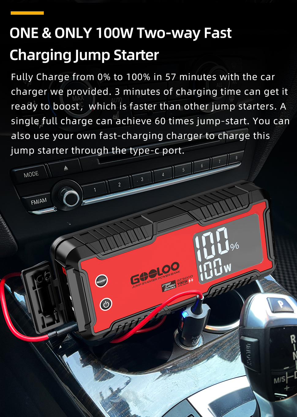Полная зарядка от 0% до 100% за 57 минут с помощью автомобильного зарядного устройства, которое мы предоставили. 3 минуты времени зарядки могут быть готовы к ускорению, что быстрее, чем у других стартеров. Одной полной зарядкой может достигать 60 раз начать. Вы также можете использовать свое зарядное устройство для быстрой зарядки для зарядки этого стартера через порт type-c.