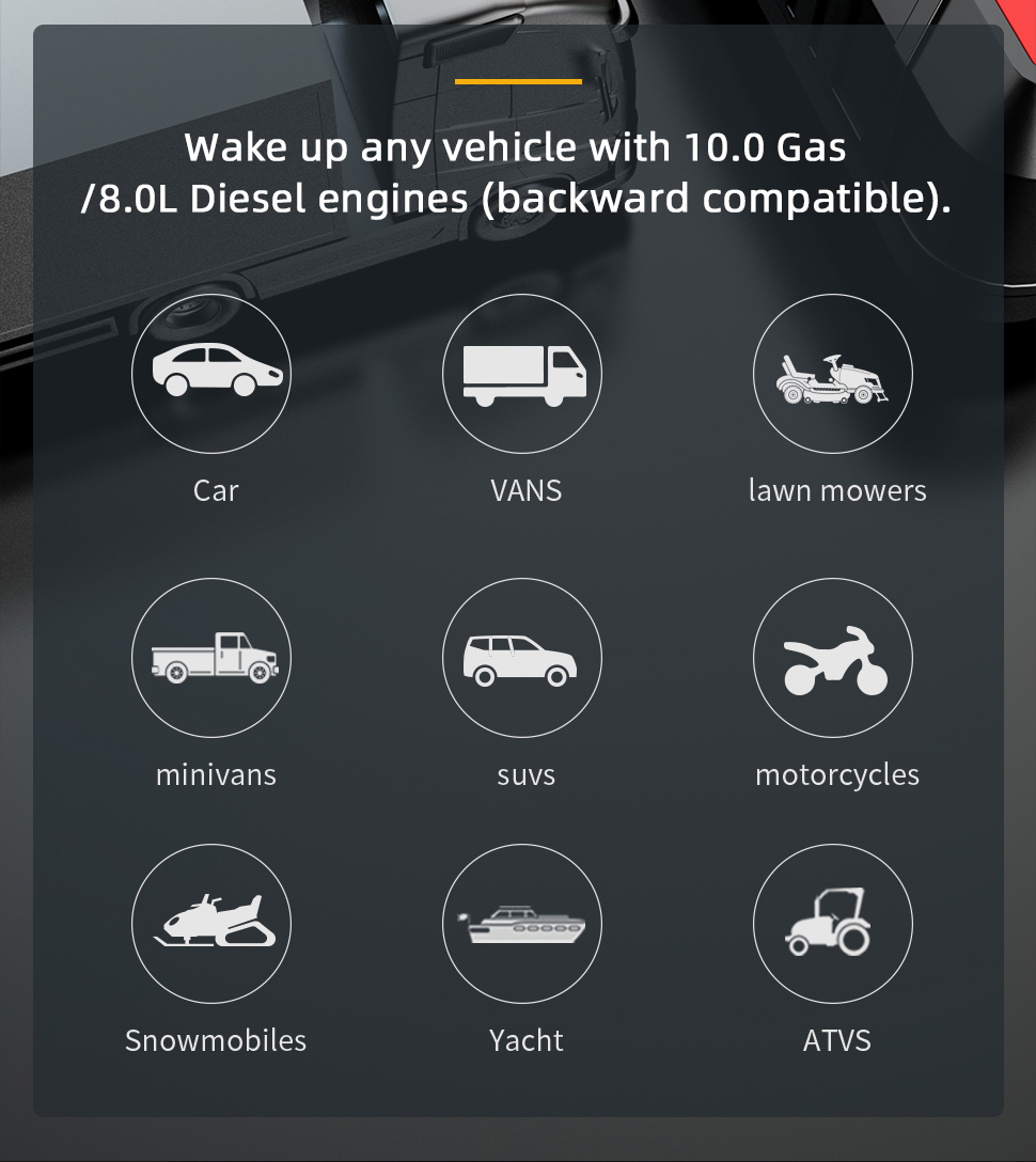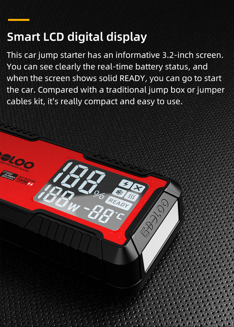 Этот автомобиль Пусковое устройство для стартера имеет информативный 3,2-дюймовым экраном. Вы можете четко видеть состояние аккумулятора в режиме реального времени, и когда экран будет полностью готов, вы можете перейти к запуску автомобиля. По сравнению с традиционным набором кабелей jump box или jumper, он действительно компактный и простой в использовании.