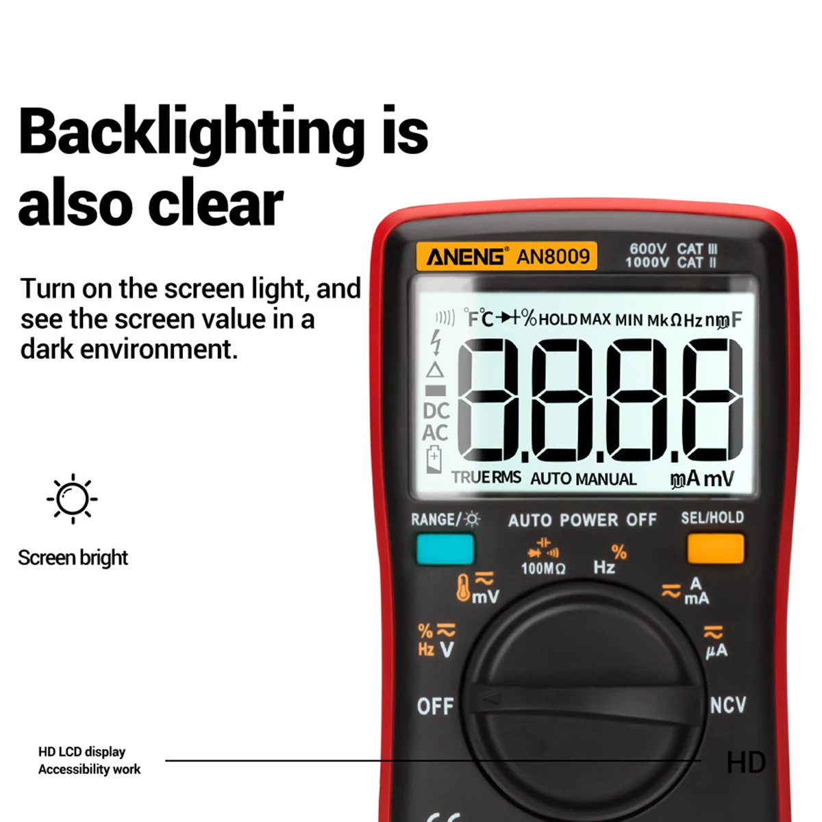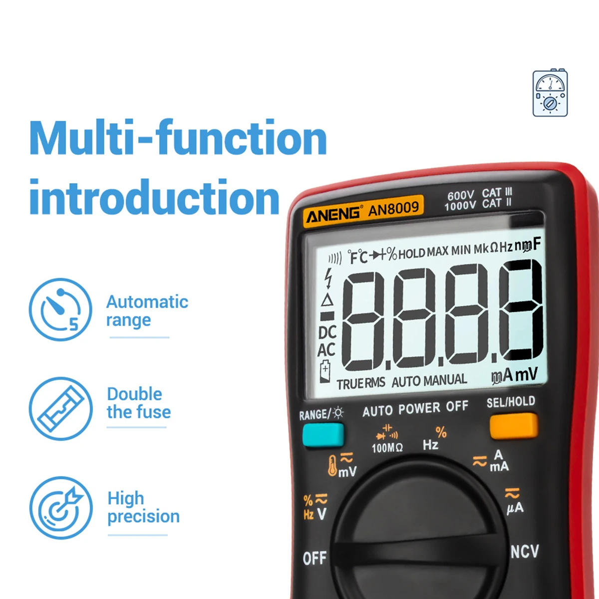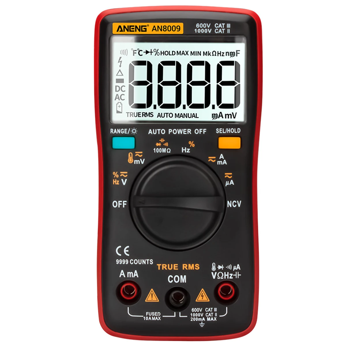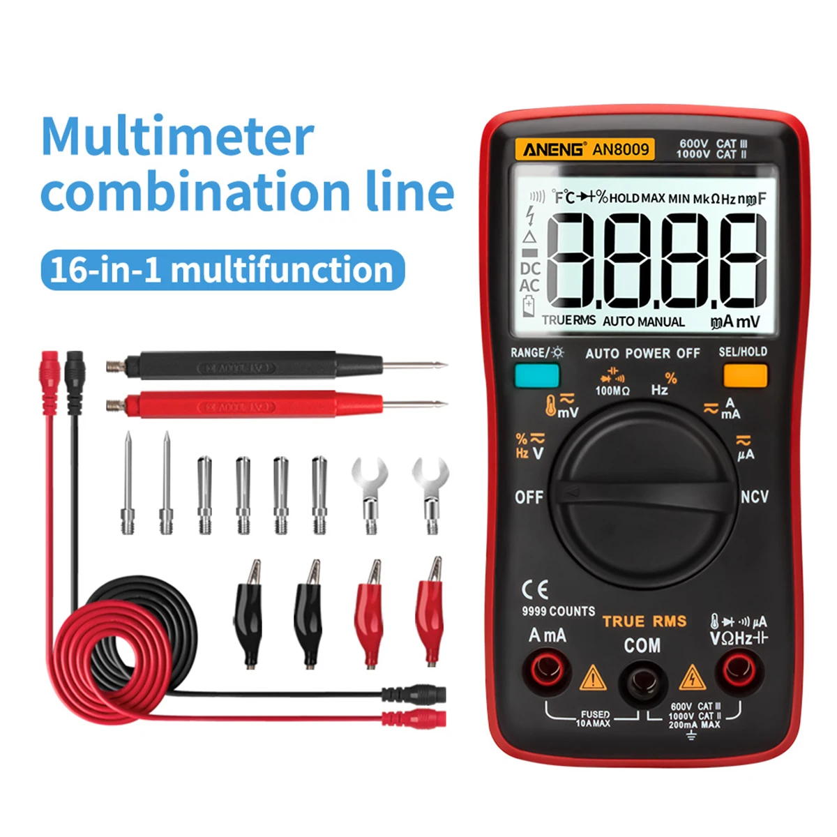 AN8009-один из первых 9999, автоматический цифровой мультиметр. Этот продукт работает от батареи с true-rms, светодиодный дисплей и подсветка. Модель цифрового мультиметра может измерять напряжение переменного/постоянного тока, постоянный ток, сопротивление, непрерывность, диоды, транзистор и так далее. Портативный и простой в использовании. Он может хорошо обслуживать в области обслуживания авто, электротехники и лабораторного обучения, и т. Д.