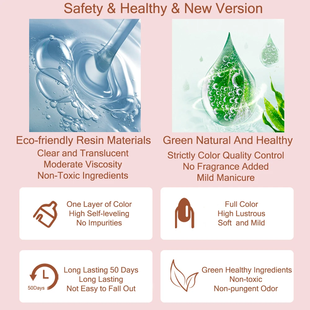 Экологически чистые и безопасен для здоровья красивый и популярный летний Гель-лак цвета сделаны из 9 Токсин Бесплатно ингредиент, который обеспечивает безопасность и имеет слабый запах. Нет жесткой ингредиенты или клея, которые приводят к поврежденных ногтей.