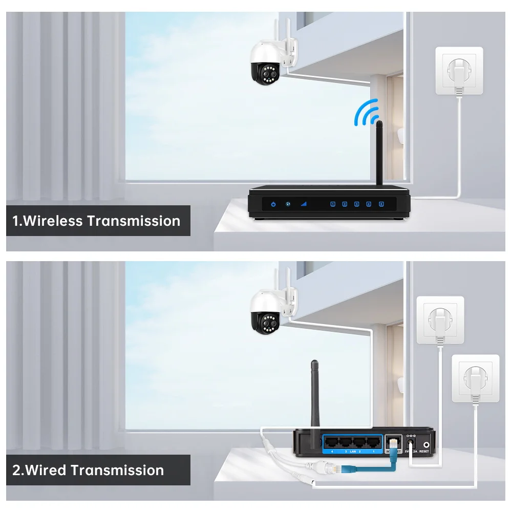 Питание от адаптера DC12V, вы можете подключить камеру к сети Wi-Fi. Вы можете настроить подключение к Wi-Fi камеры или поиск по локальной сети с помощью сетевого кабеля, подключенного к маршрутизатору, работает только с Wi-Fi 2,4G (не поддерживает 5G).