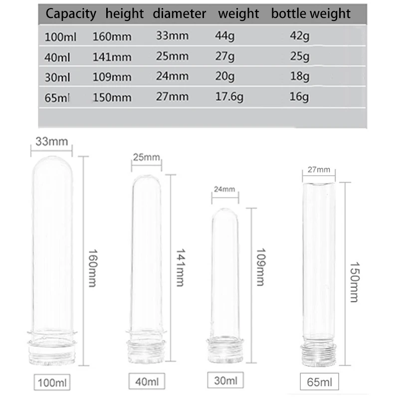2) 40ml: total height 141mm, bottle height (not include the cap)140mm, bottle body diameter 25mm, caliber 28mm.