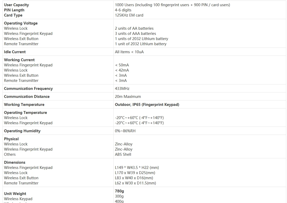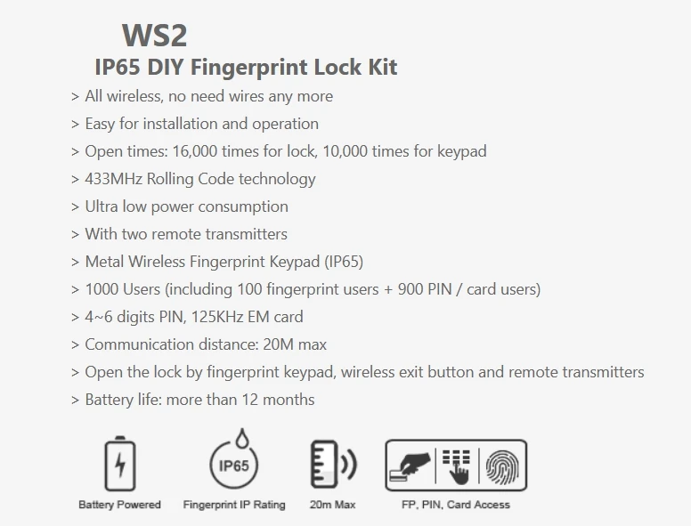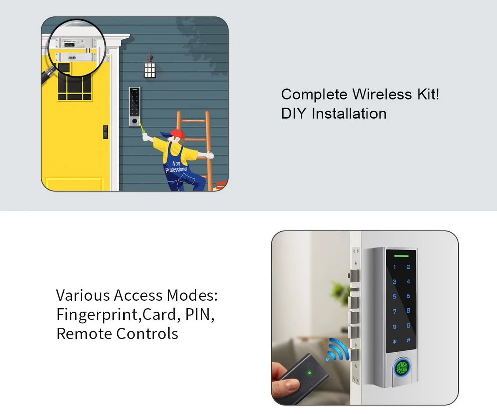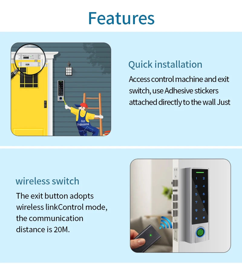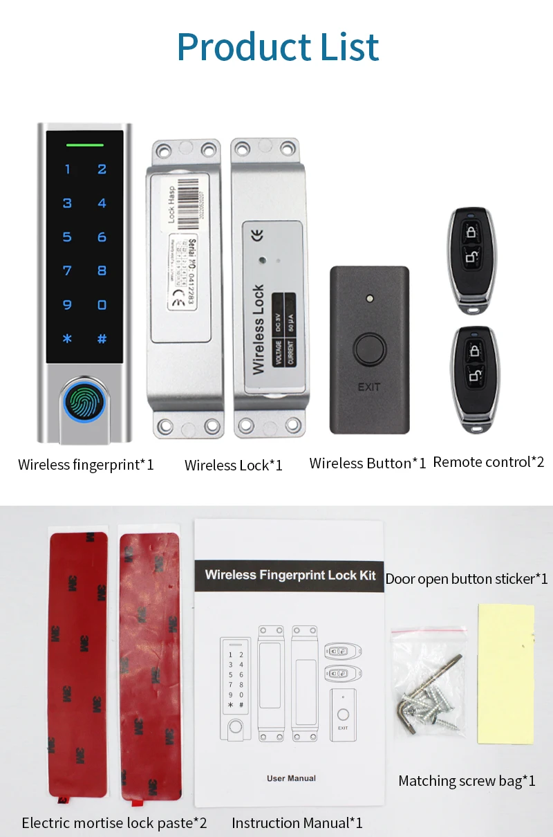 Этот комплект представляет собой набор комплектных беспроводных замков отпечатков пальцев для домашнего/офисного использования. Он состоит изБеспроводная клавиатура отпечатков пальцев, AБеспроводной болтовый замок(Подходит для металлических/деревянных дверей и стеклянных дверей в рамке), аБеспроводная кнопка выхода,2 дистанционных передатчика. Супер сильный 3M наклейки обеспечивает простой способ установки.
