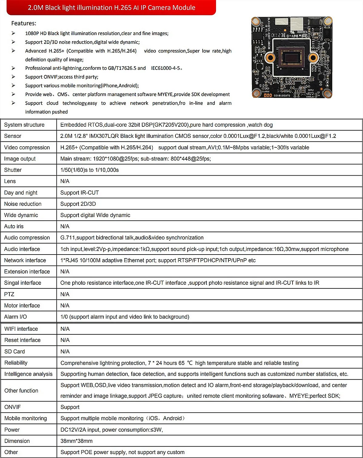 3MP GK7205V200 + IMX307 H.265 HD IP-камера Модульная плата 2304*1296 Низкое освещение ONVIF CMS XMEYE P2P RTSP