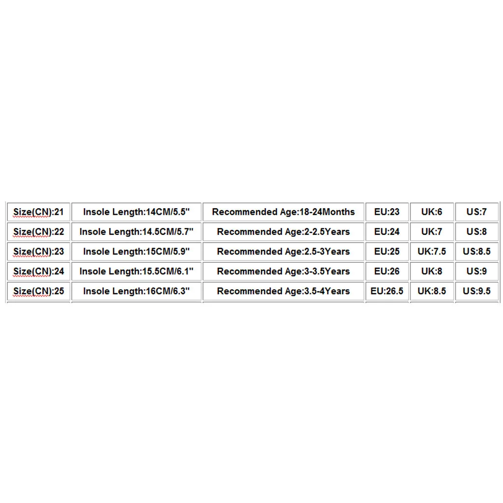 | Размер (CN): 22 | Длина стельки: 14,5 см/5,7" | Рекомендуемый возраст: 2-2.5Years | ЕС: 24 | Великобритания: 7 | США: 8 |