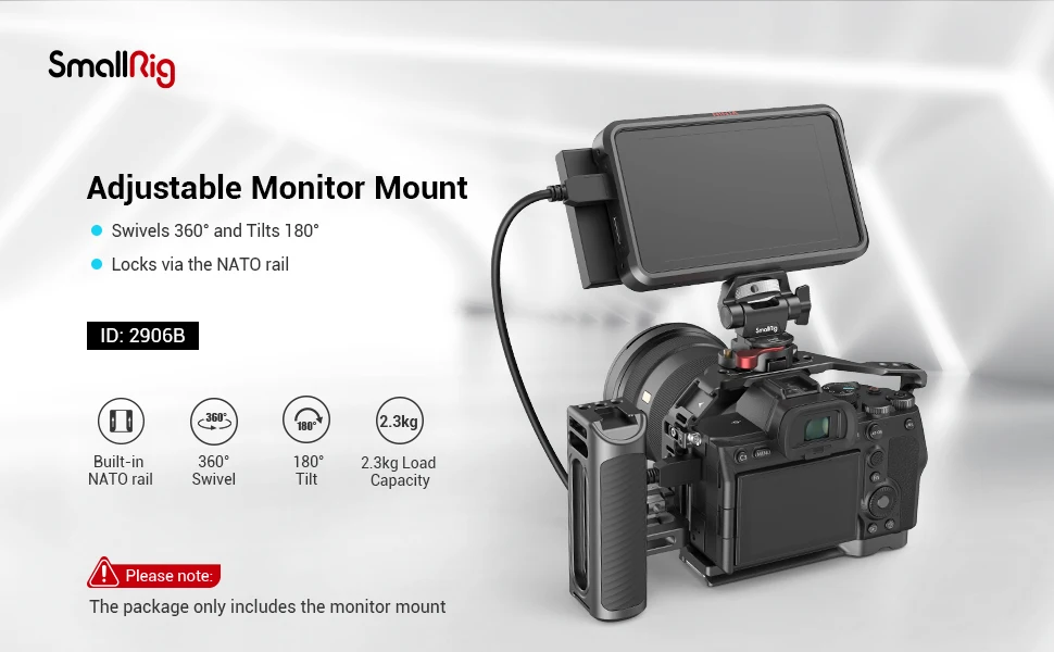 SmallRig поворотное и наклонное регулируемое крепление для монитора с креплением-зажимом NATO 2906 Предназначен для удержания вашего монитора для удобного мониторинга. Он подходит для стандартного рельса NATO для быстрого крепления и поставляется с верхним винтом 1/4 "-20 для монитора, микрофона, светильник и т. д. крепление может наклоняться на 180 ° и поворачиваться на 360 °. Свой наклон оси быстро затянуть с помощью ручки, чтобы соответствовать различным весом и испытания прочности, с возможностью наклона грузоподъемность снижение не более чем на 20% после 10000 с углом наклона, В то время как его ось панорамирования 360 ° регулируется с помощью шестигранного ключа. Надежная фиксатор на верхней части защищает Ninja V/ V +. Винты имеют отверстия для шестигранного ключа для облегчения сборки и разборки.